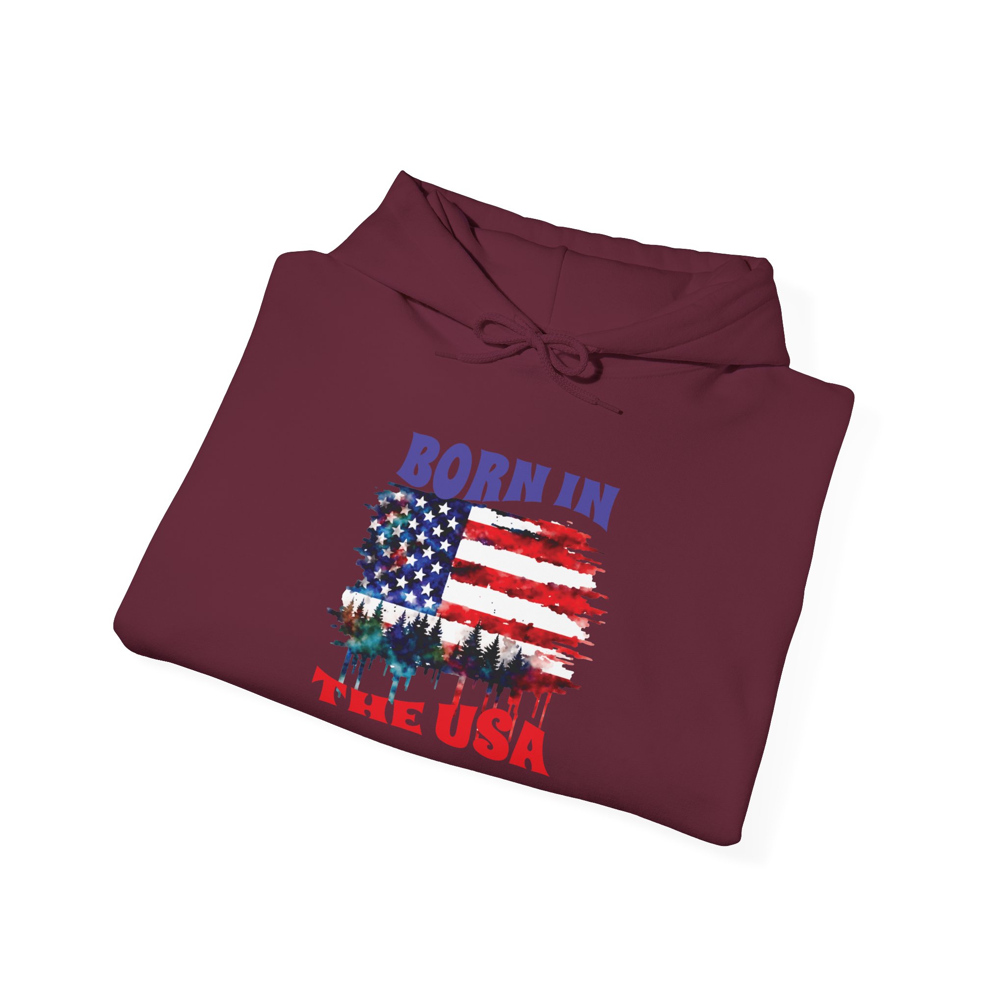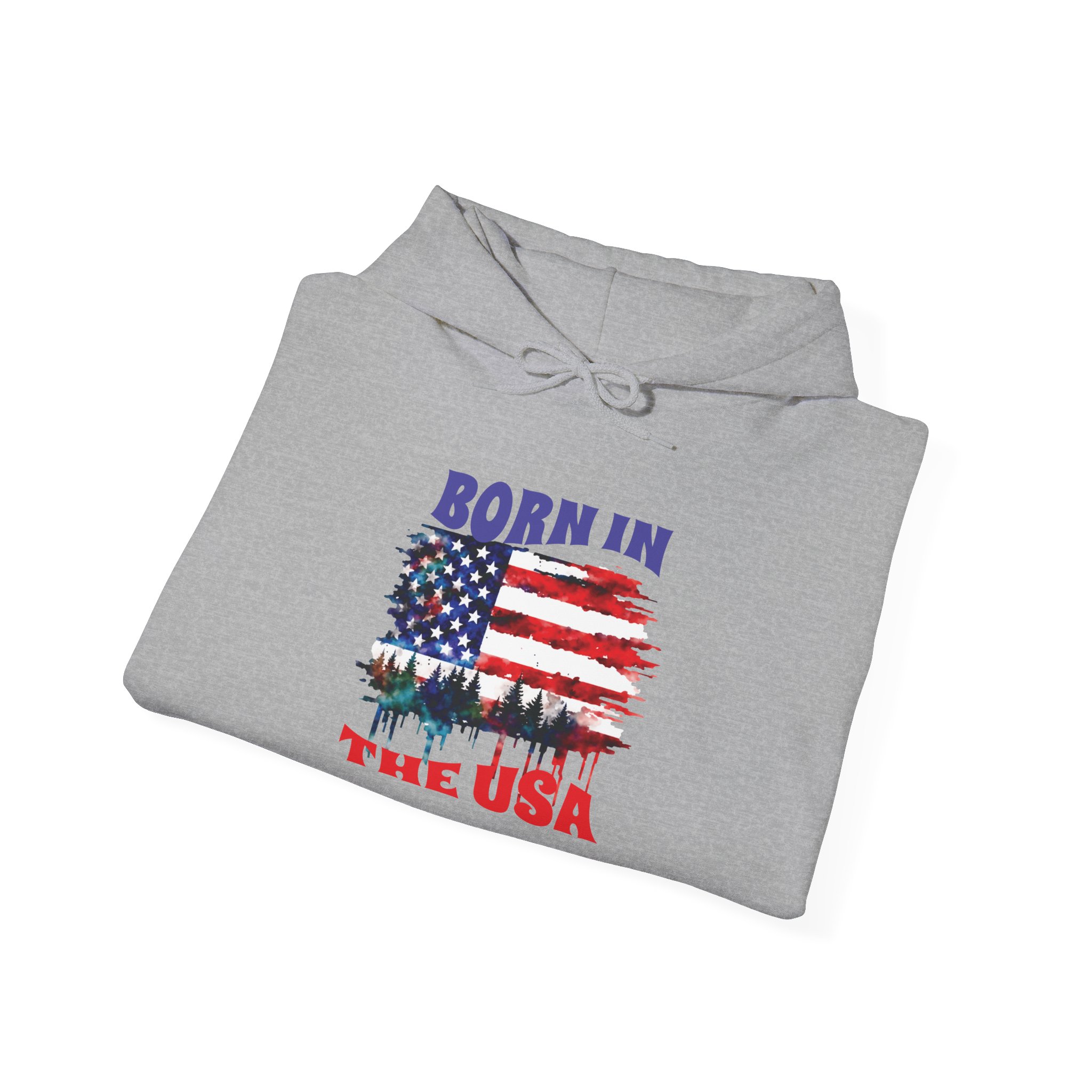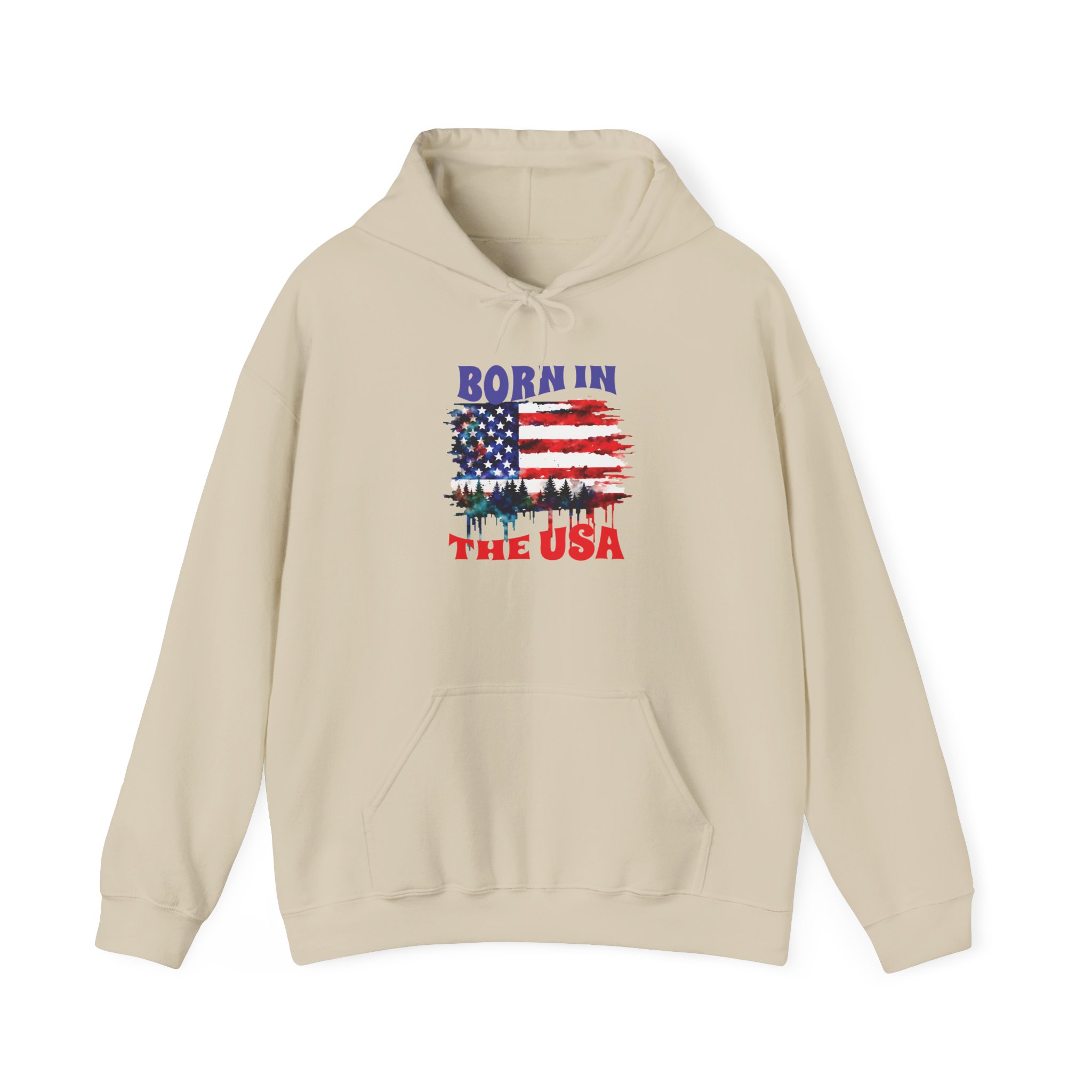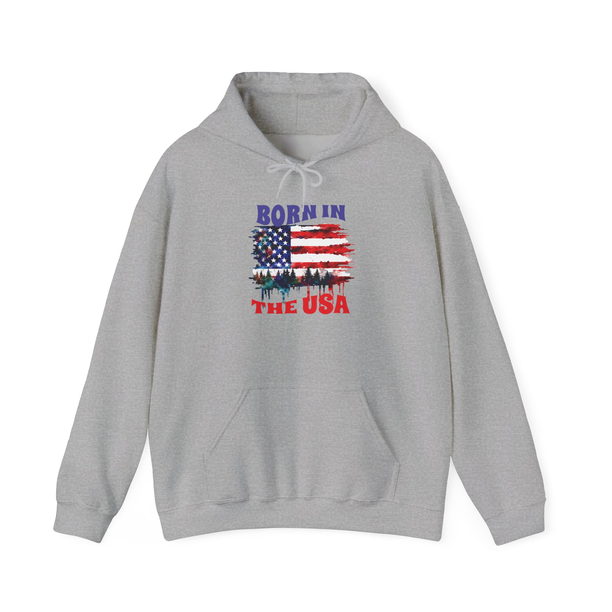A cozy, USA-themed hooded sweatshirt that feels like pulled-together comfort with a clear patriotic voice. The soft, medium-weight blend keeps you warm on crisp mornings while the classic pouch pocket and adjustable hood add everyday practicality. The front features a distressed American flag graphic with tree silhouettes and the text “Born in the USA,” giving it a lived-in, outdoorsy character — good for backyard barbecues, Fourth of July drives, or quiet walks through pine-lined trails. Built without side seams for a smooth fit and printed with high-quality DTF/DTG methods, this hoodie wears well and keeps its design sharp. Subtle details like a color-matched drawcord, double-lined hood, and tear-away label make it comfortable for all-day wear.