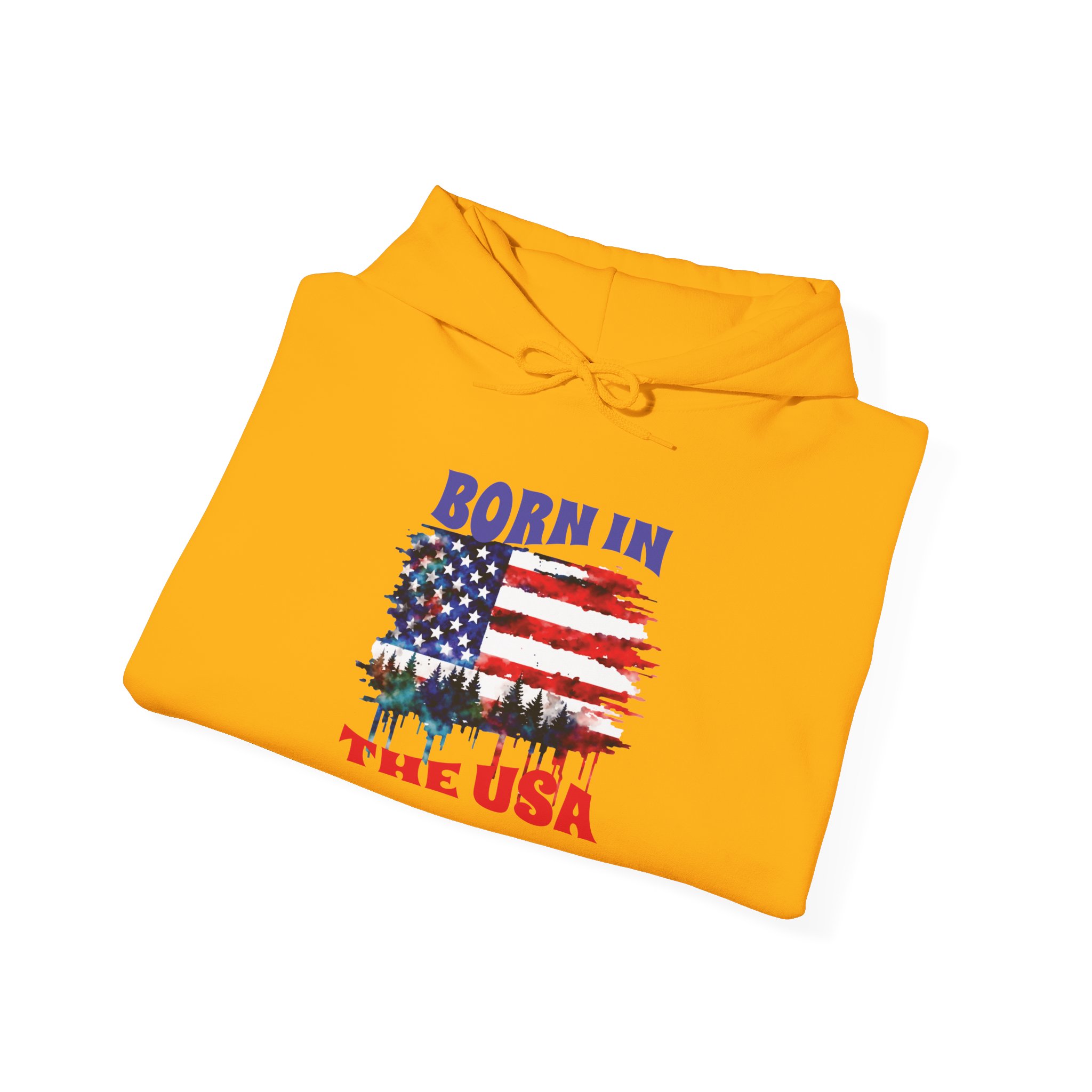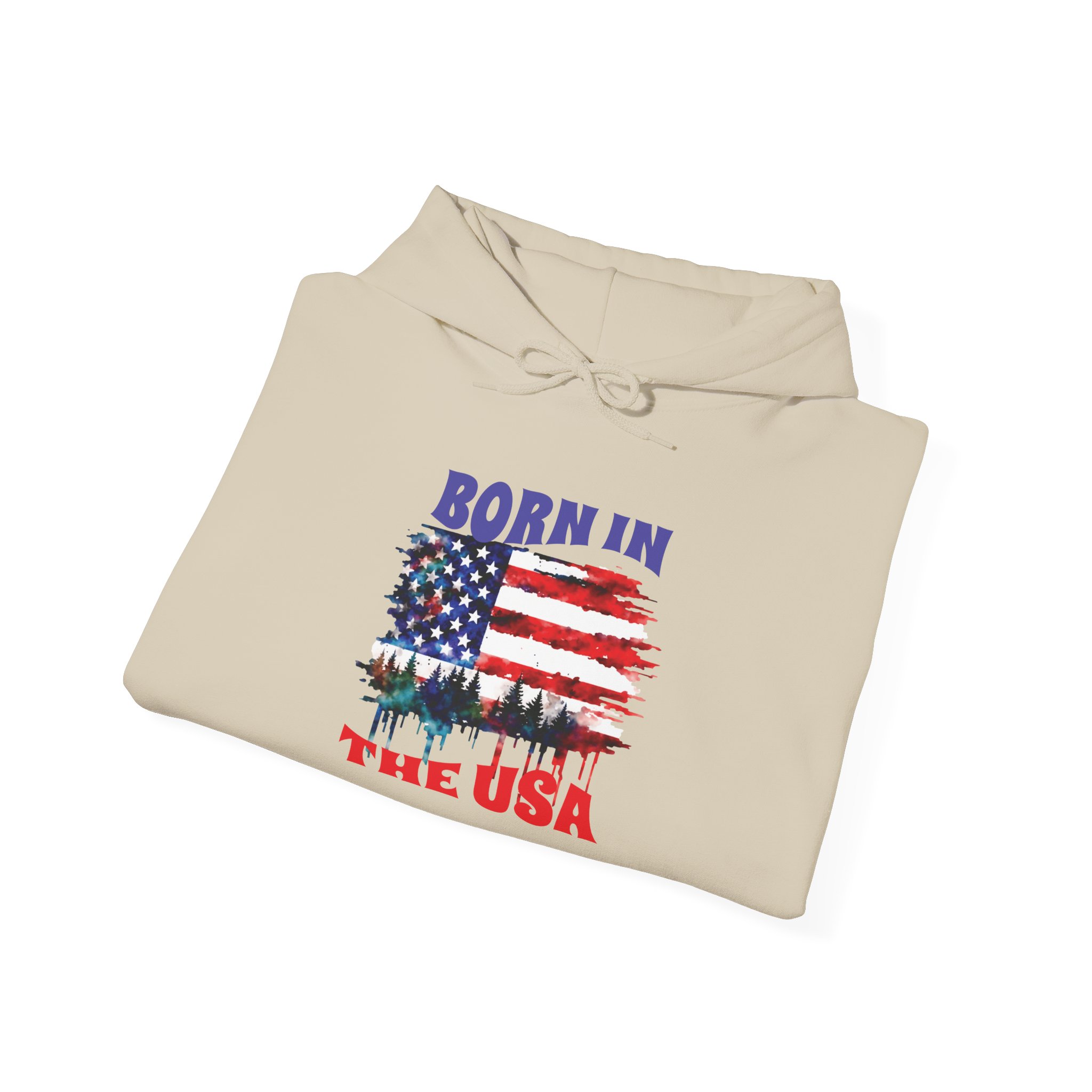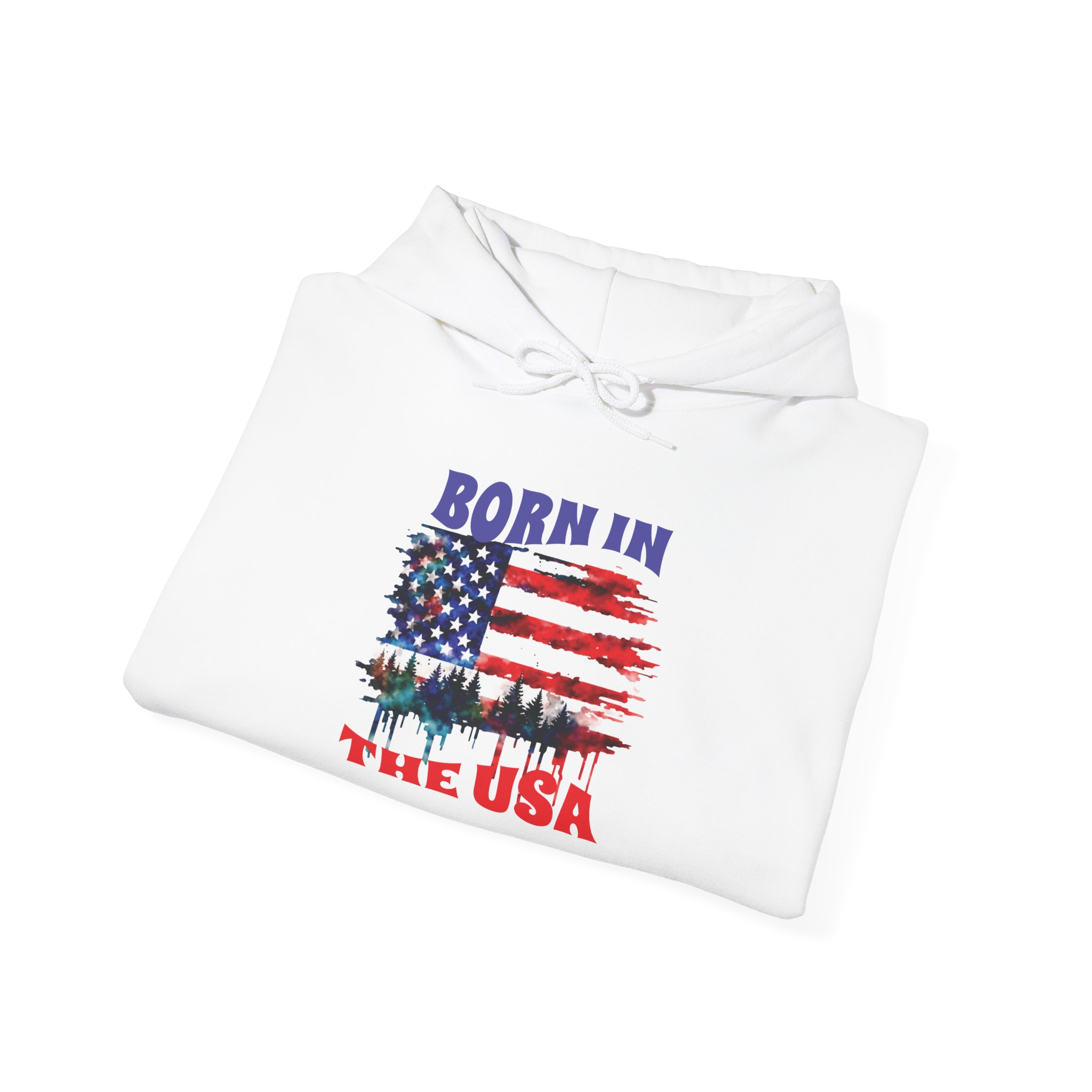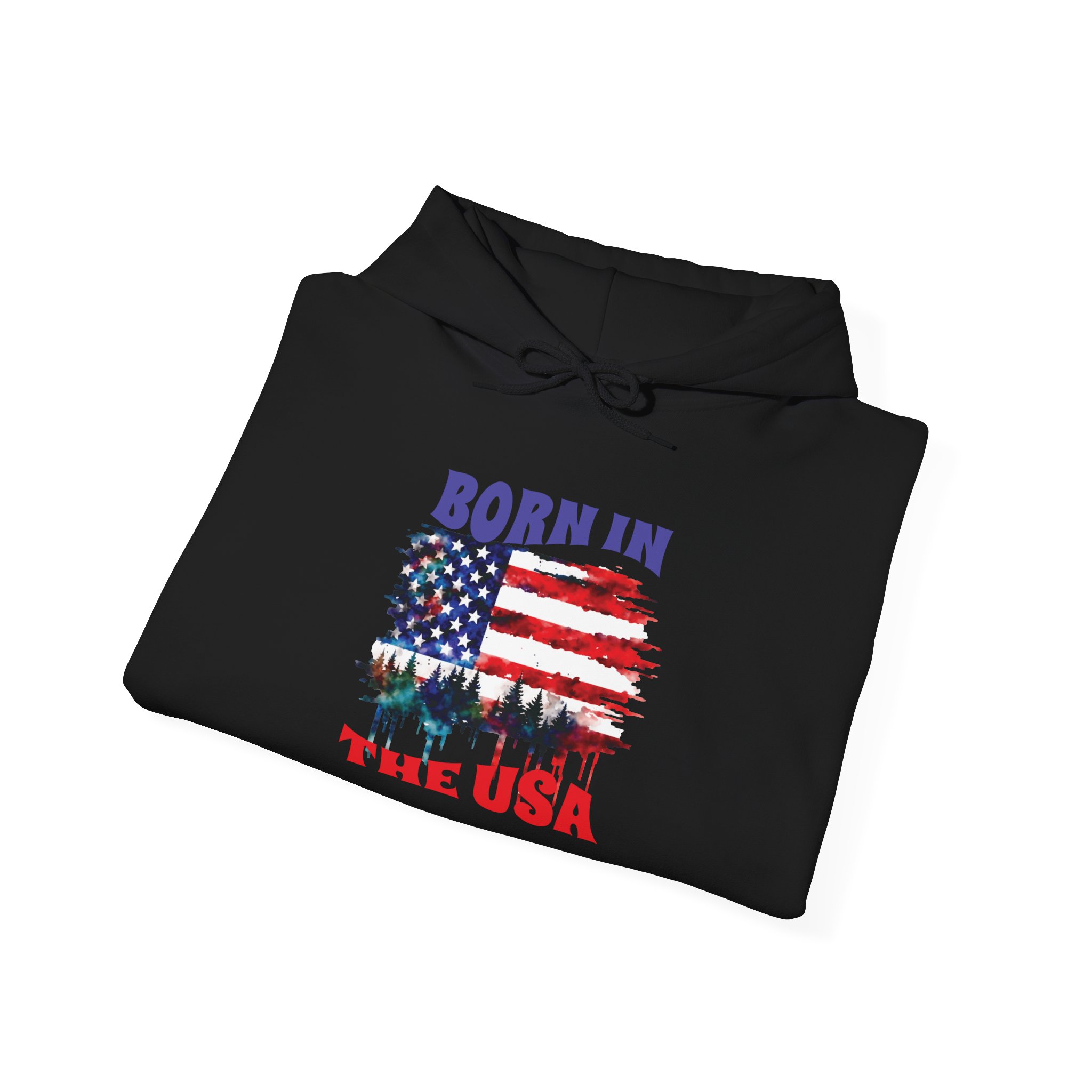 A cozy, USA-themed hooded sweatshirt that feels like pulled-together comfort with a clear patriotic voice. The soft, medium-weight blend keeps you warm on crisp mornings while the classic pouch pocket and adjustable hood add everyday practicality. The front features a distressed American flag graphic with tree silhouettes and the text “Born in the USA,” giving it a lived-in, outdoorsy character — good for backyard barbecues, Fourth of July drives, or quiet walks through pine-lined trails. Built without side seams for a smooth fit and printed with high-quality DTF/DTG methods, this hoodie wears well and keeps its design sharp. Subtle details like a color-matched drawcord, double-lined hood, and tear-away label make it comfortable for all-day wear.