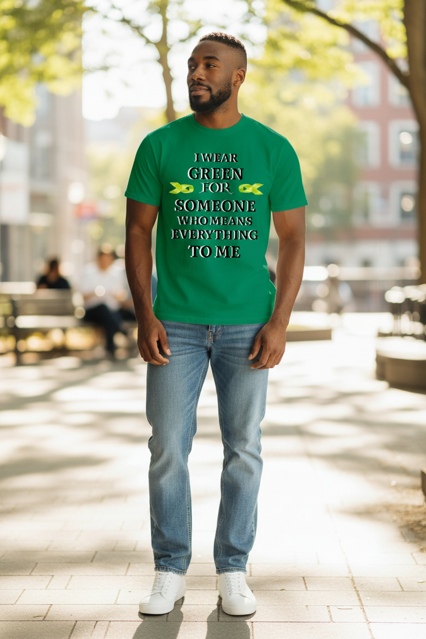 Show your love, support, and meaning with this bold and heartfelt graphic tee. Featuring the powerful message “I Wear Green For Someone Who Means Everything To Me”, this design is perfect for honoring someone special while making a stylish statement.