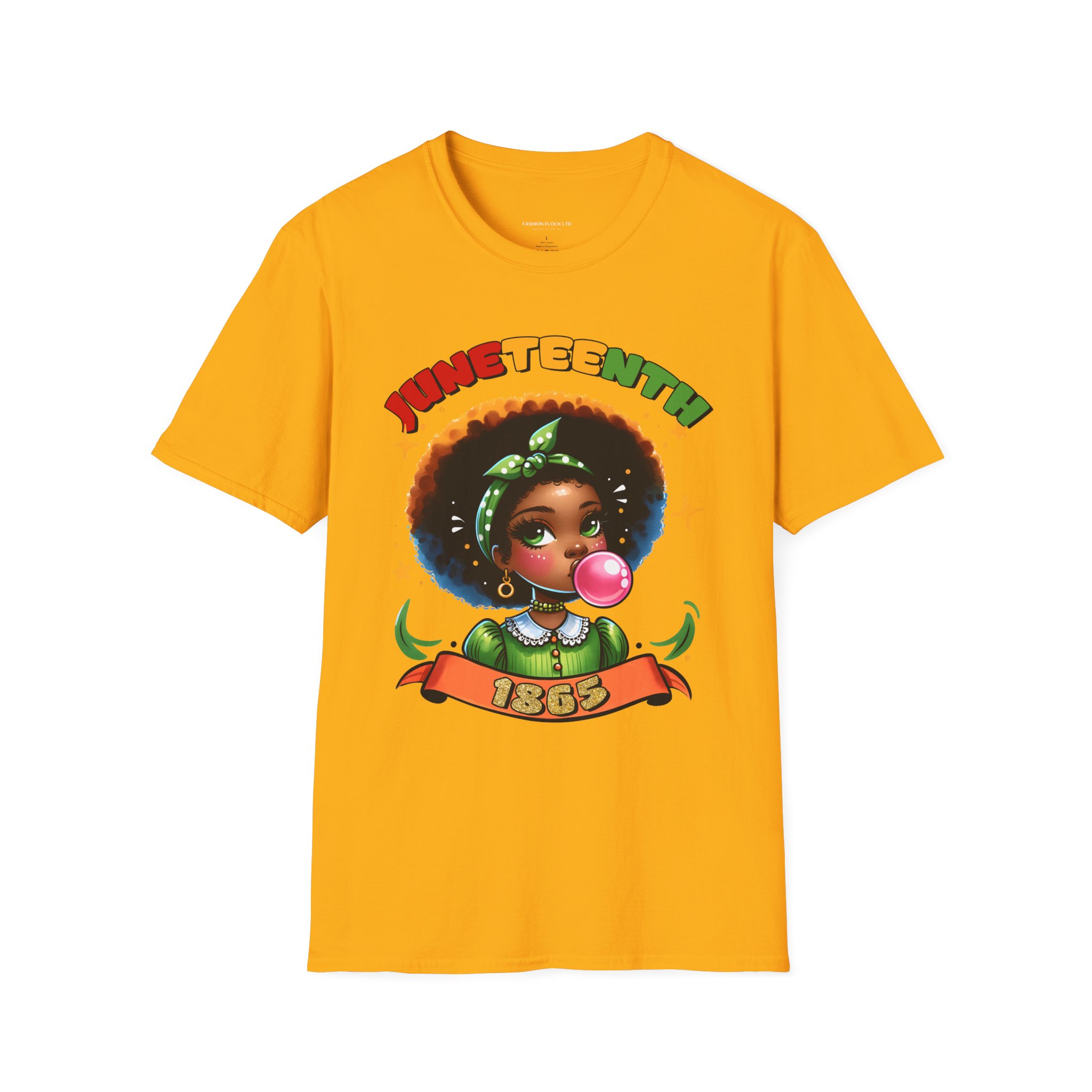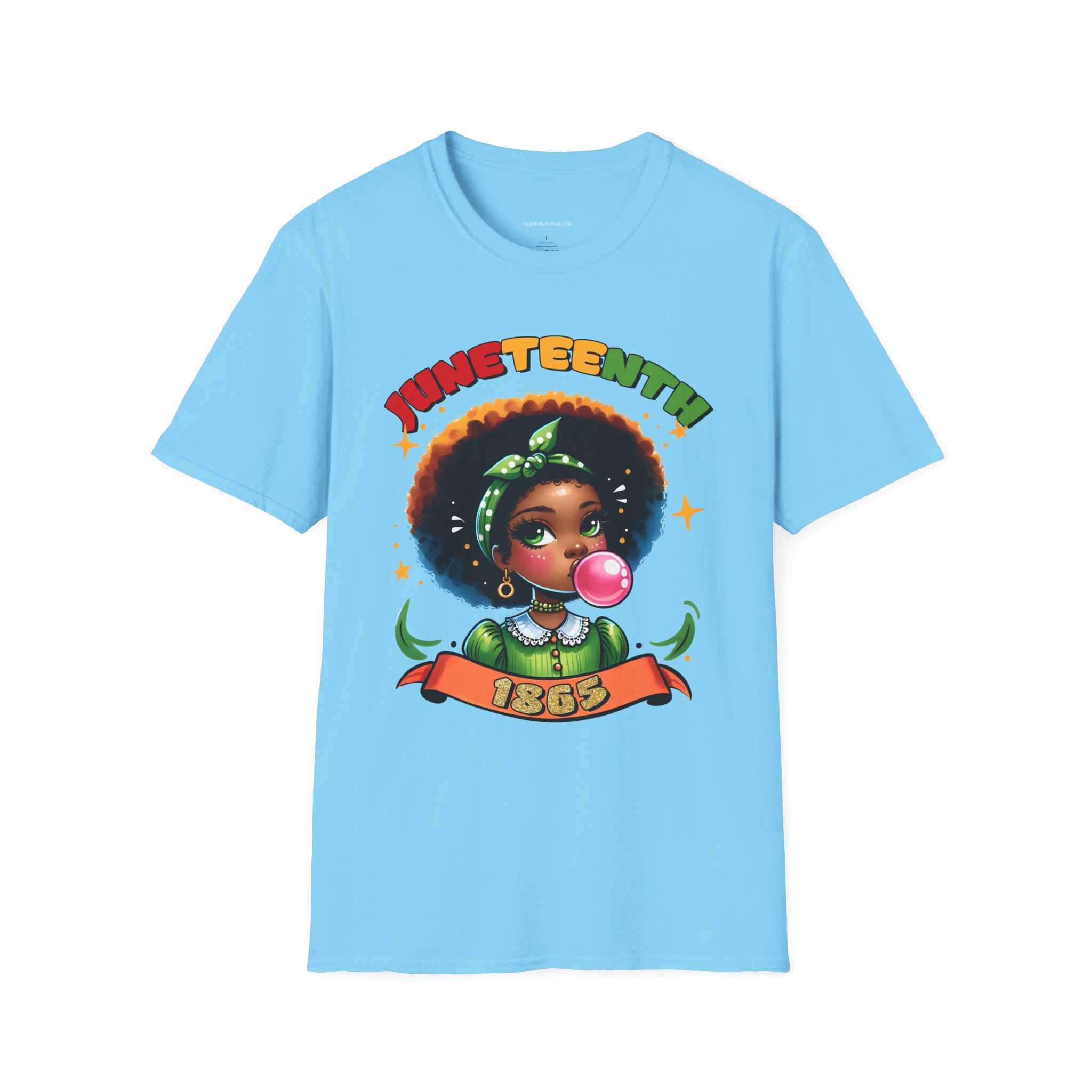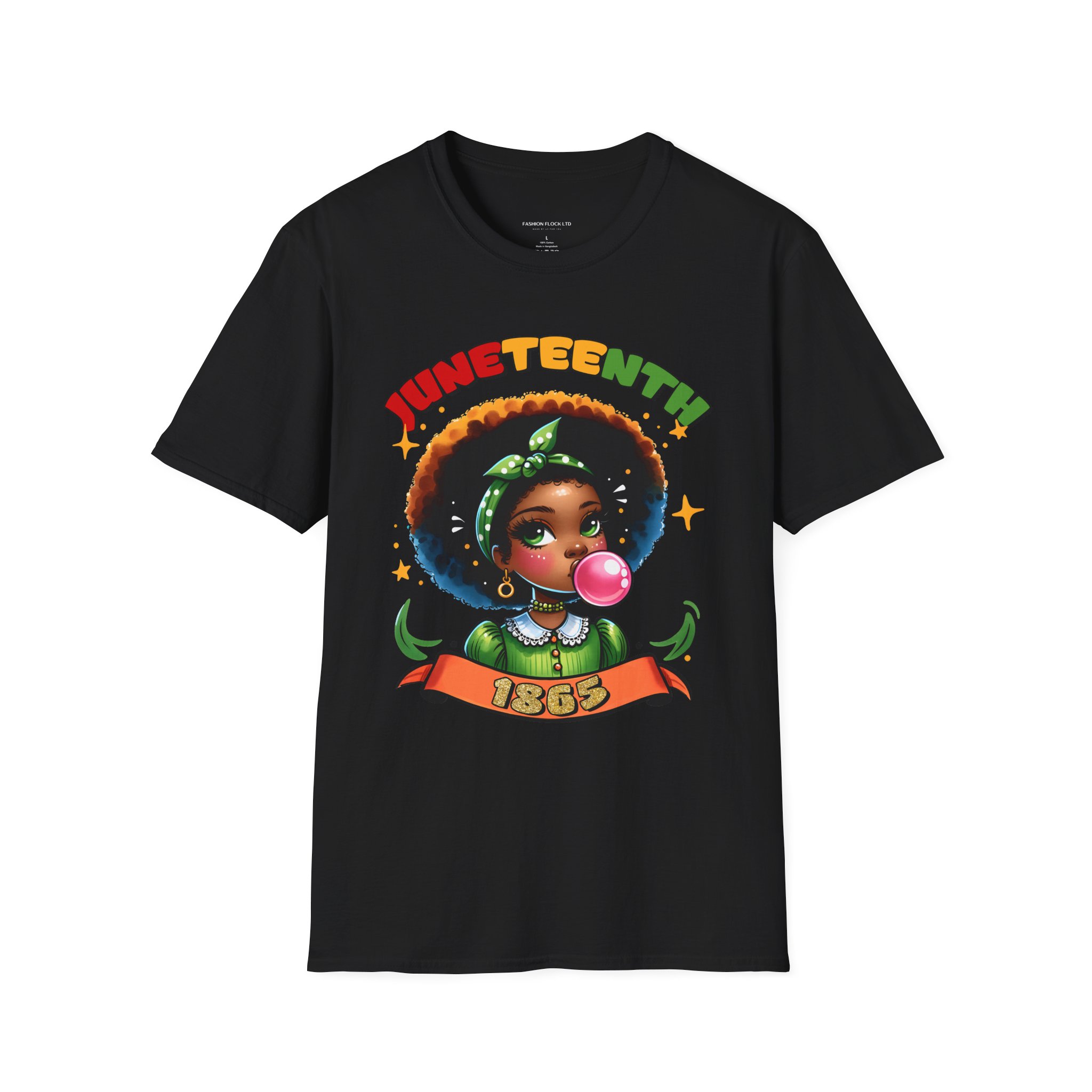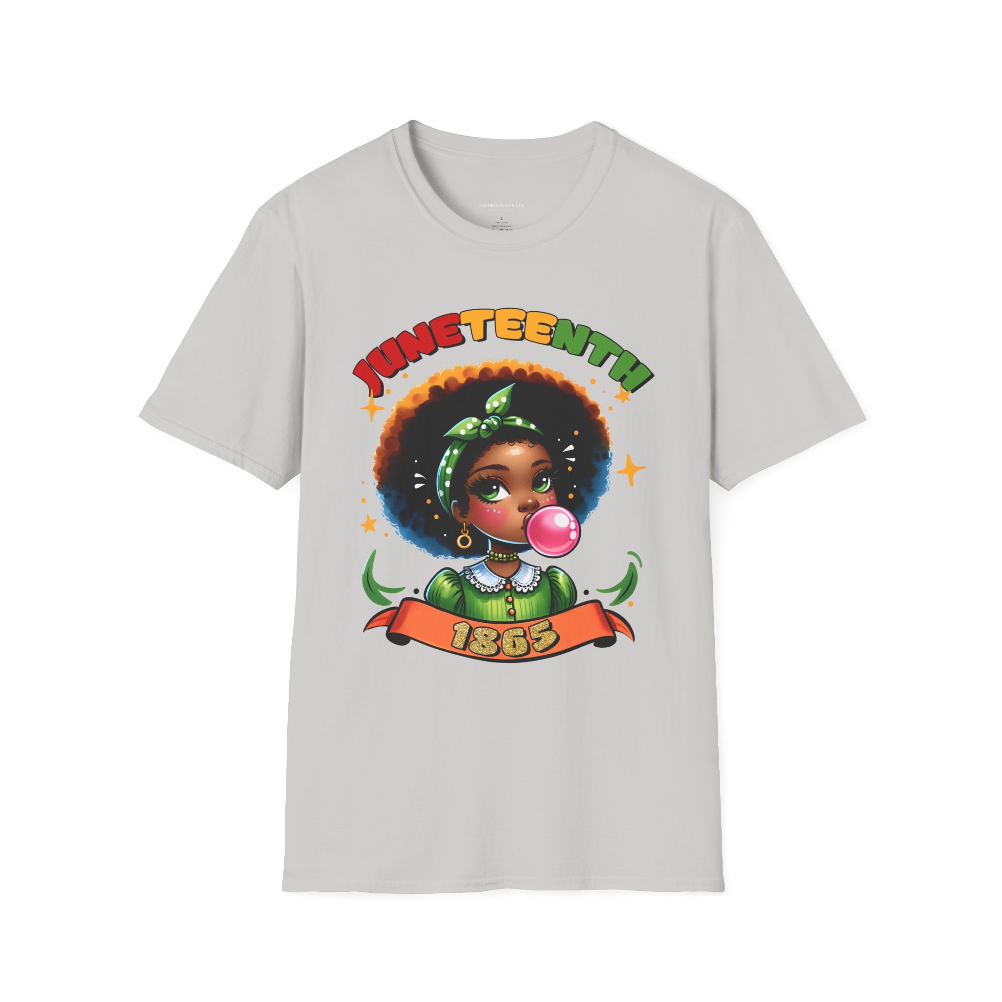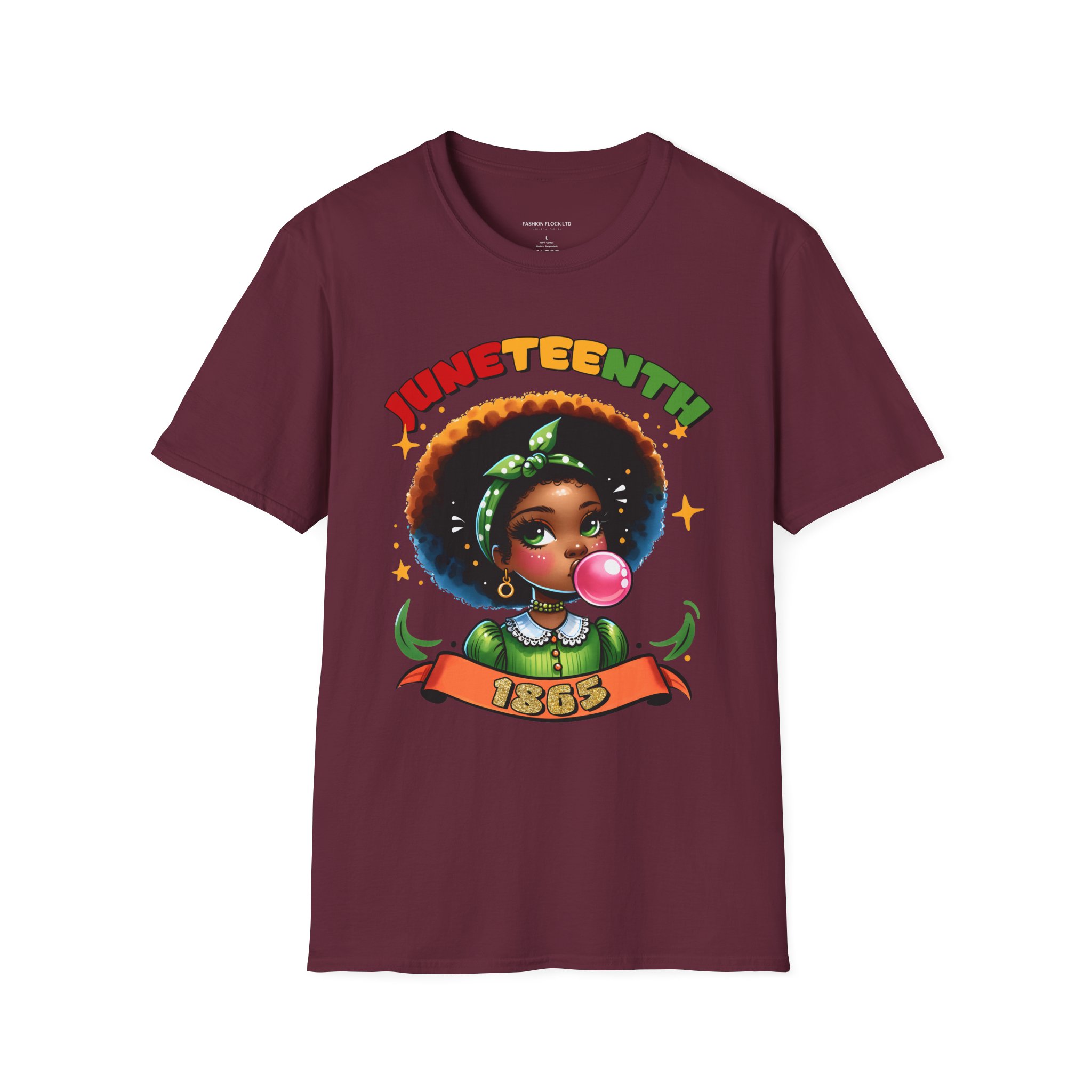 Celebrate Juneteenth with a tee that feels like a warm nod from history and a bright wink from today. Soft, breathable cotton drapes easily over your shoulders while the vibrant illustration—an Afro-haired girl blowing bubblegum framed by colorful lettering and the 1865 banner—brings joy and pride to any casual lineup. Wear it to community gatherings, marches, backyard cookouts, or low-key hangouts to carry a playful yet meaningful reminder of freedom and resilience. The design sits front-and-center, bold but approachable, so conversations start naturally and smiles follow. This shirt moves with you, holds its shape, and keeps the artwork vivid through washes, making it a reliable piece in a wardrobe that honors heritage with a contemporary, youthful energy.