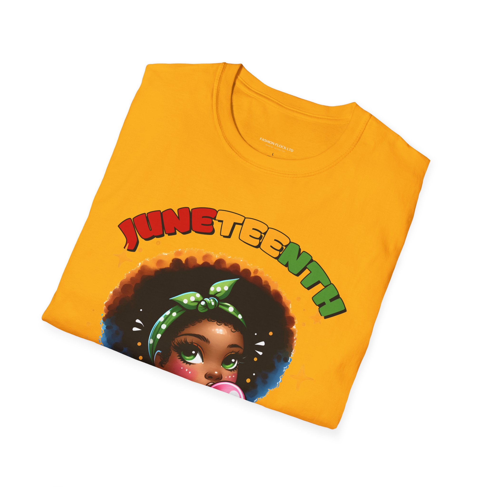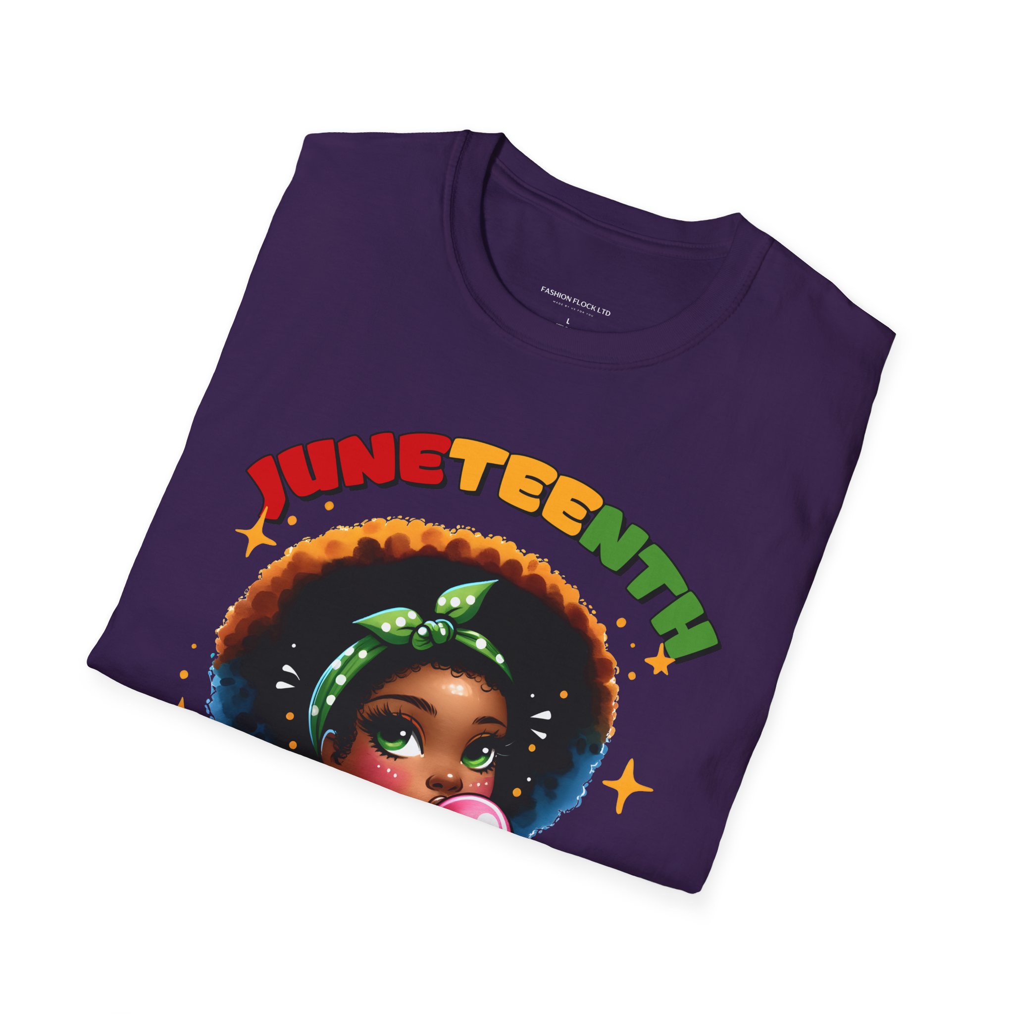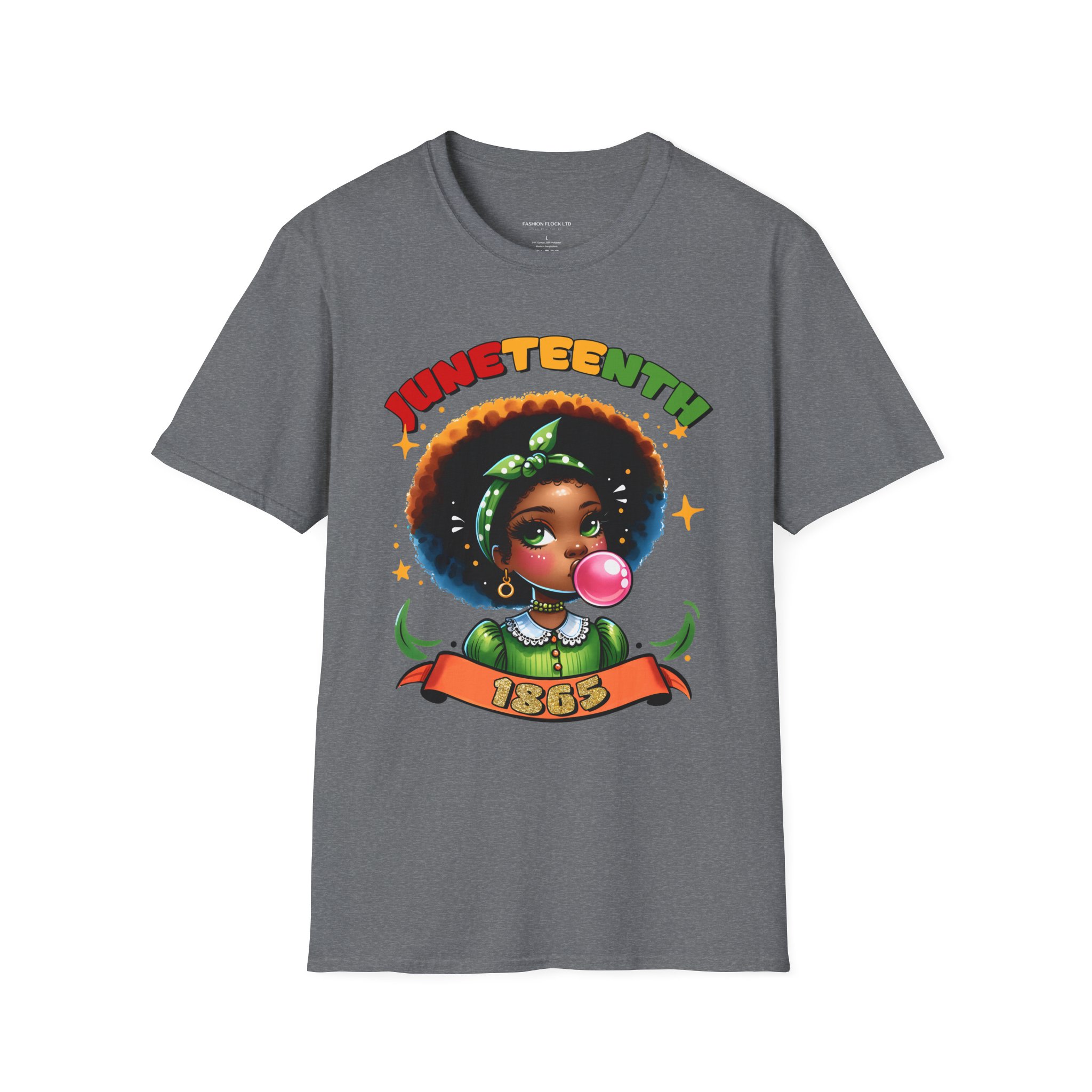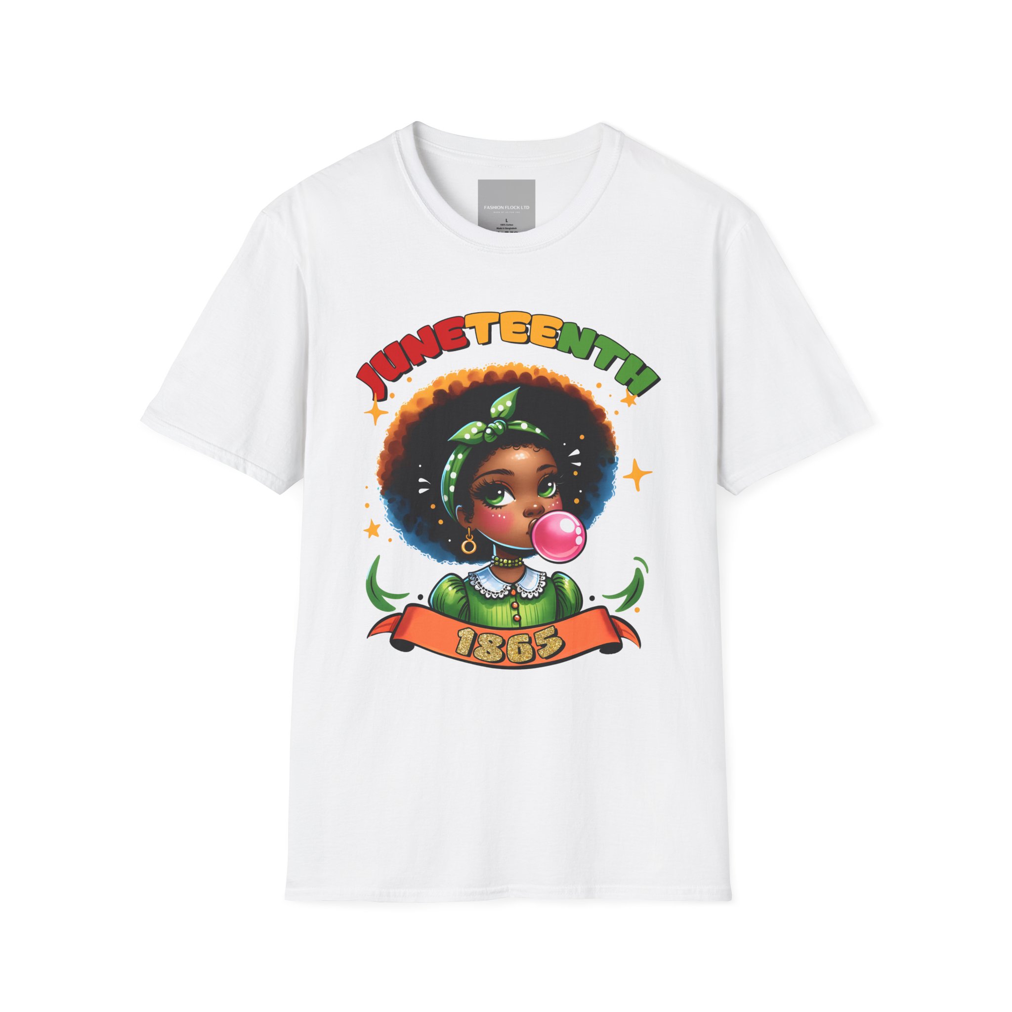 Celebrate Juneteenth with a tee that feels like a warm nod from history and a bright wink from today. Soft, breathable cotton drapes easily over your shoulders while the vibrant illustration—an Afro-haired girl blowing bubblegum framed by colorful lettering and the 1865 banner—brings joy and pride to any casual lineup. Wear it to community gatherings, marches, backyard cookouts, or low-key hangouts to carry a playful yet meaningful reminder of freedom and resilience. The design sits front-and-center, bold but approachable, so conversations start naturally and smiles follow. This shirt moves with you, holds its shape, and keeps the artwork vivid through washes, making it a reliable piece in a wardrobe that honors heritage with a contemporary, youthful energy.