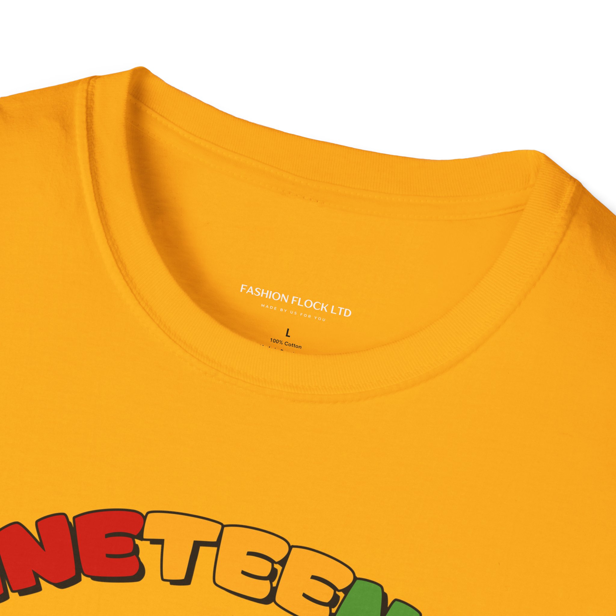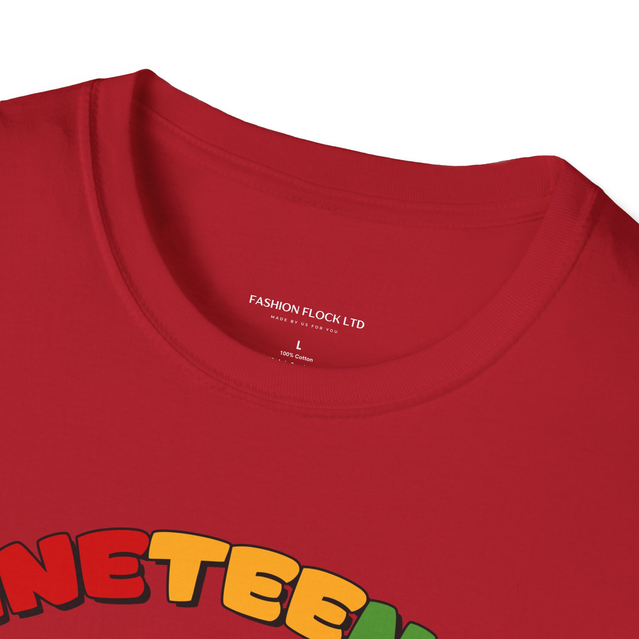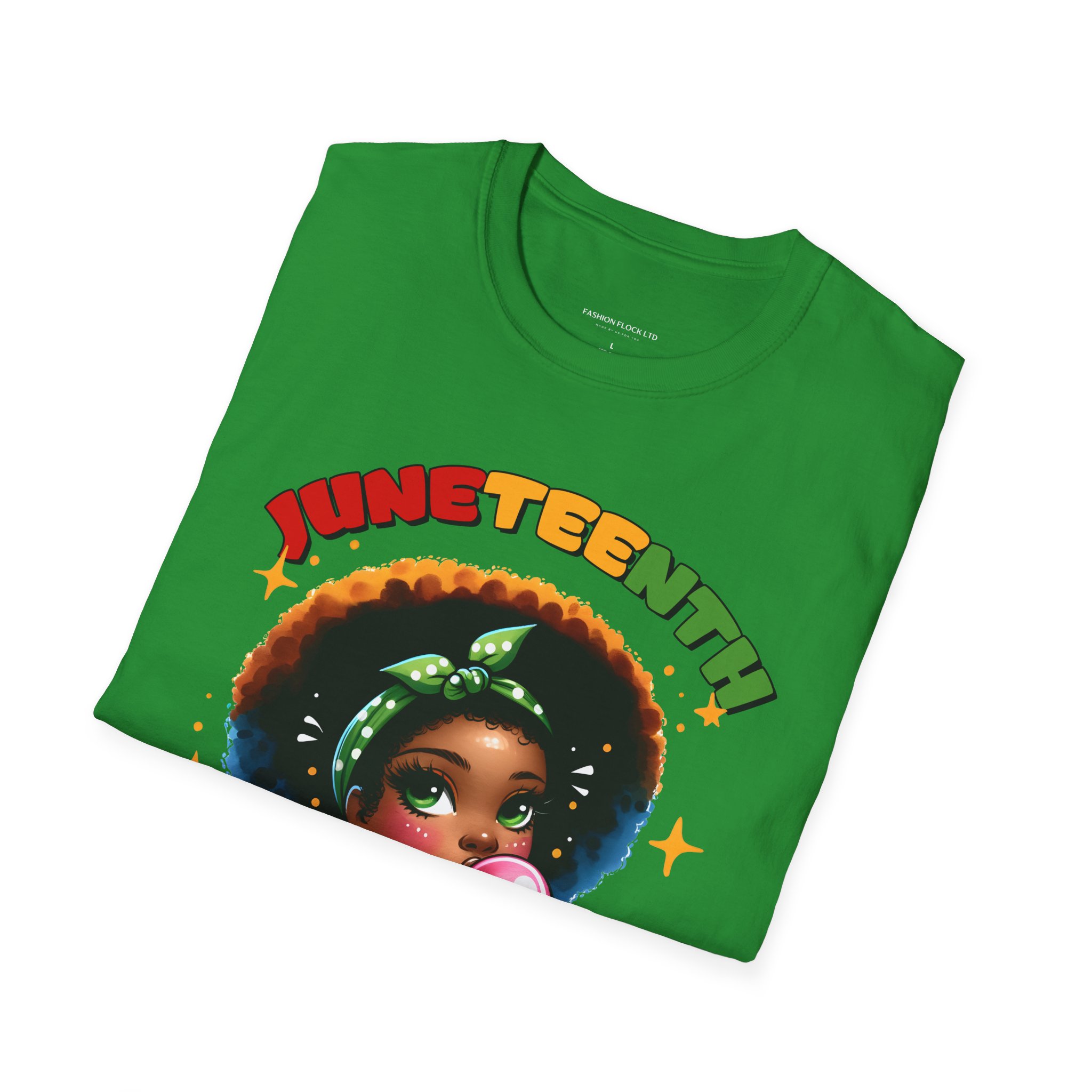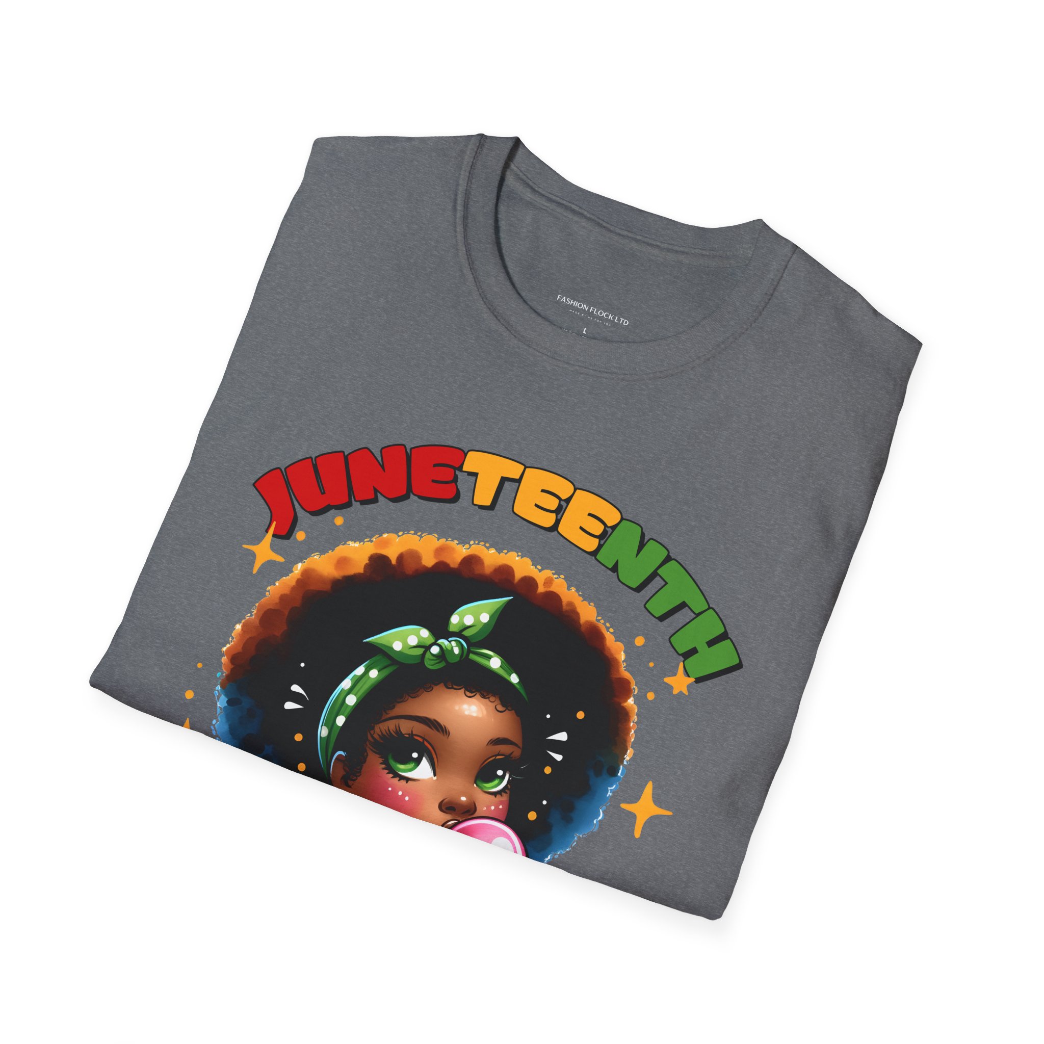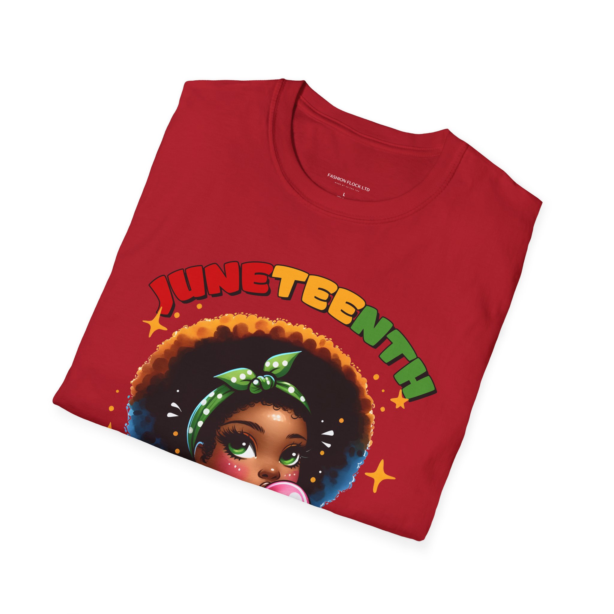 Celebrate Juneteenth with a tee that feels like a warm nod from history and a bright wink from today. Soft, breathable cotton drapes easily over your shoulders while the vibrant illustration—an Afro-haired girl blowing bubblegum framed by colorful lettering and the 1865 banner—brings joy and pride to any casual lineup. Wear it to community gatherings, marches, backyard cookouts, or low-key hangouts to carry a playful yet meaningful reminder of freedom and resilience. The design sits front-and-center, bold but approachable, so conversations start naturally and smiles follow. This shirt moves with you, holds its shape, and keeps the artwork vivid through washes, making it a reliable piece in a wardrobe that honors heritage with a contemporary, youthful energy.